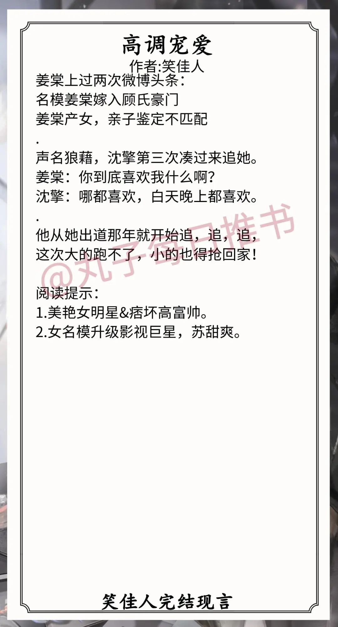 5.《高调宠爱》作者:笑佳人(美艳女明星vs忠犬高富帅,春风一度,离婚再遇真爱,渣男追妻失败,娱乐圈甜宠文)