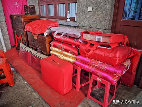 如今陕西农村女儿出嫁准备的东西依然保持传统,陪嫁的电器甚至小汽车之类早早送到婚房,只有这大红的被子和“压箱底”的箱子需要“姑爷”亲自接走架在接亲队伍车头,保持着过去婚礼的样子。
