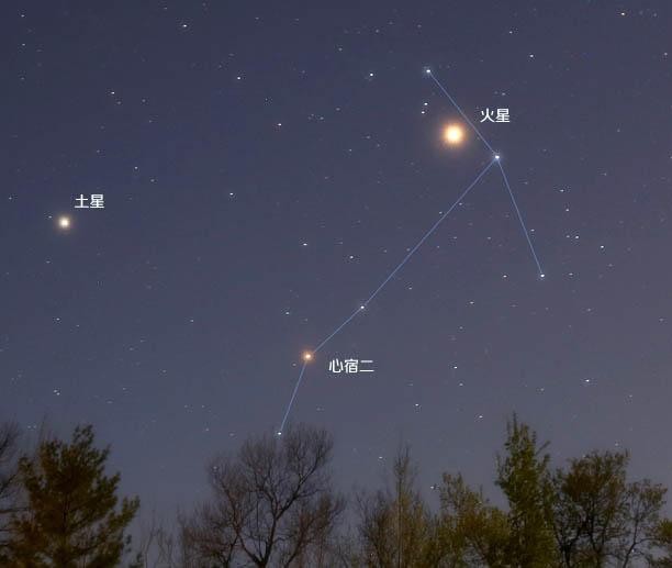 心宿二(Antares),又名大火,是一颗红超巨星。在北半球的夜空中,低悬于南方地平线上方。