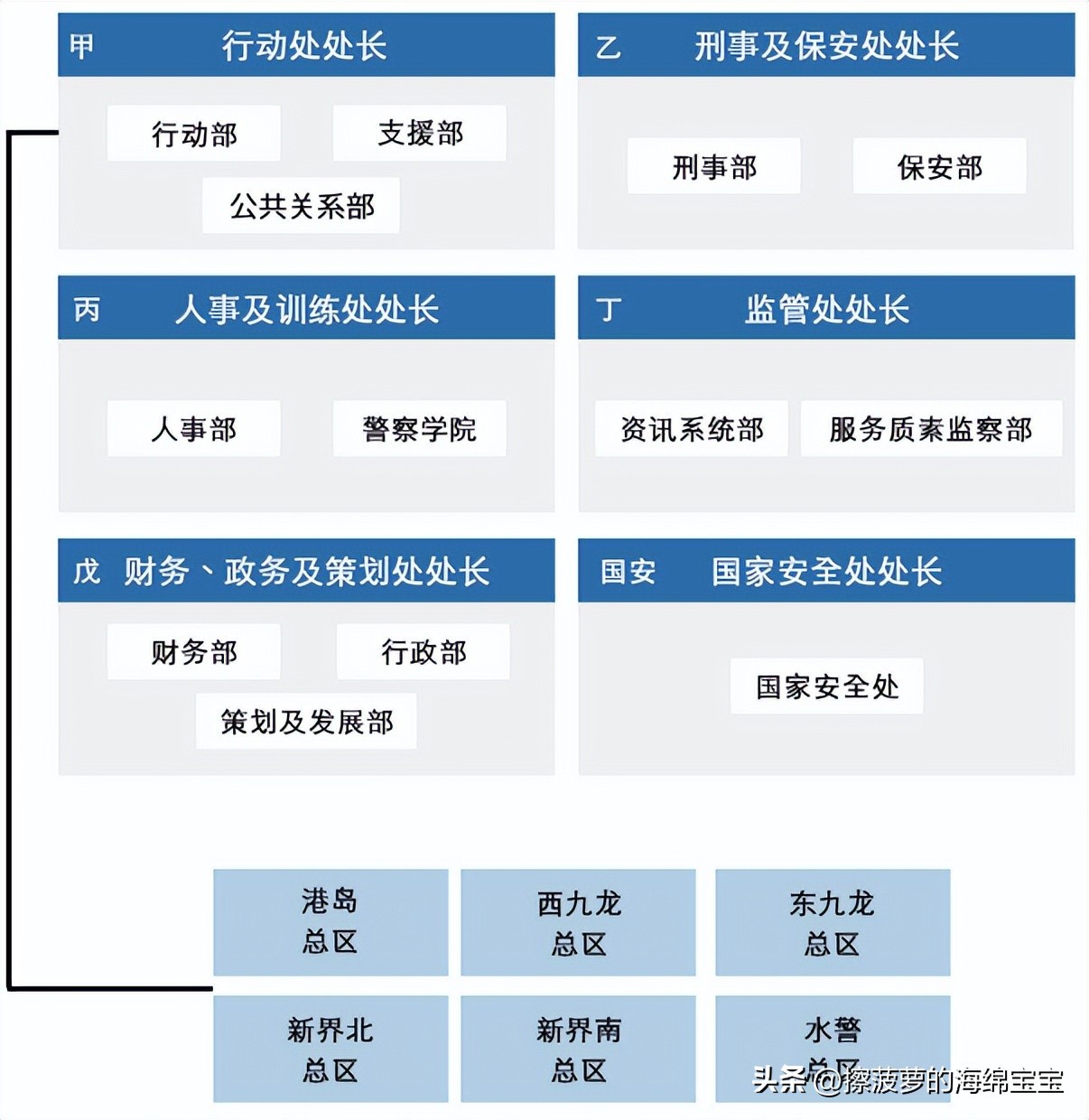 警务处助理处长:六个部门下辖主要单位的主管,其中策划及发展部由一名总警司指挥。前线警务工作由六个总区负责,每个总区指挥为警务处助理处长。