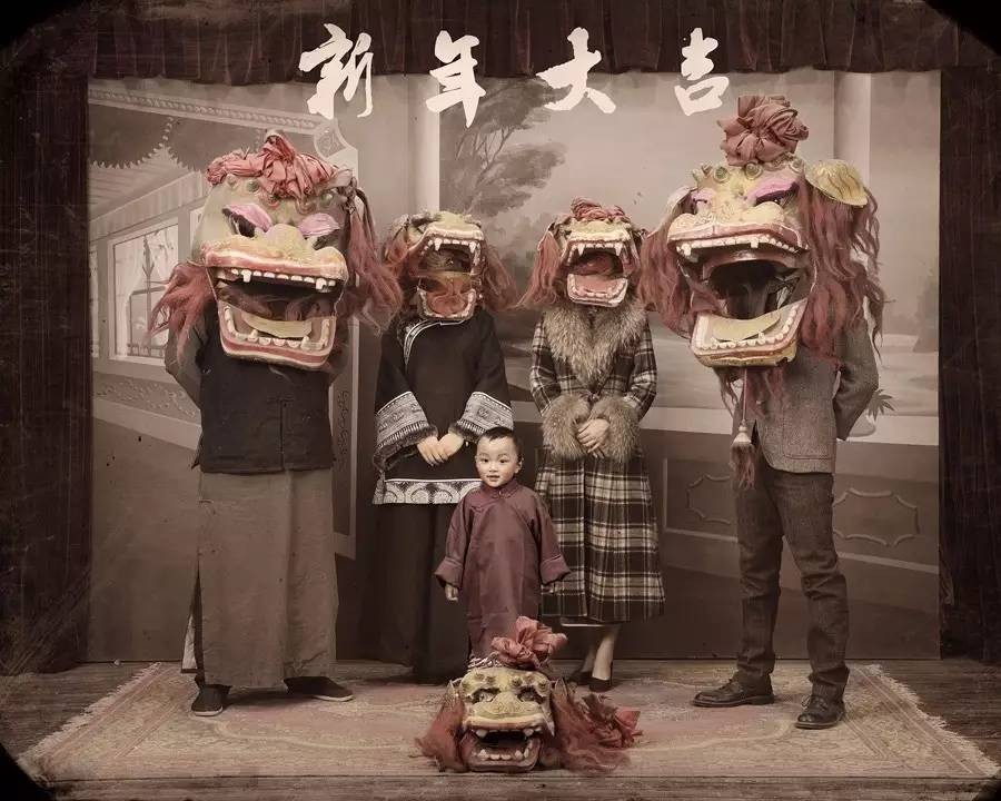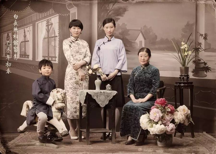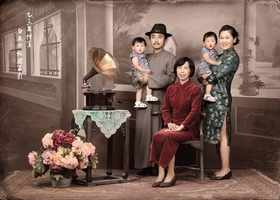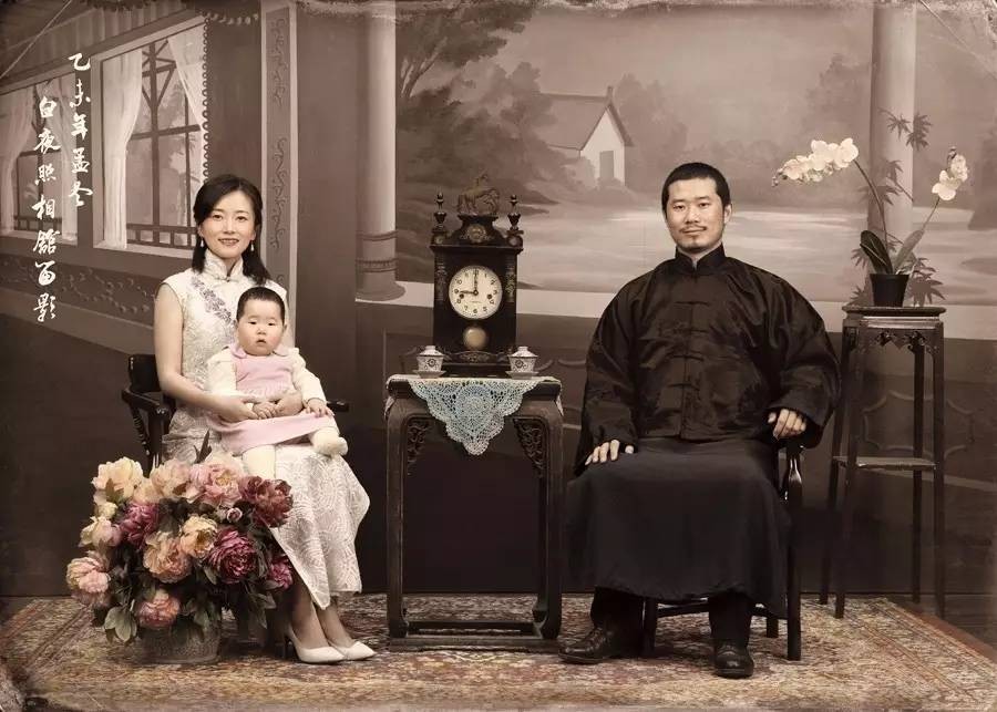 这张照片所采用的布景源自上世纪三十年代的上海“大新照相馆”,典型的民国时期家庭内景样式,是根据我们收藏的一张大新照相馆的全家合影而重新手绘而来。