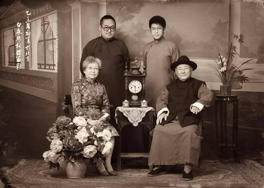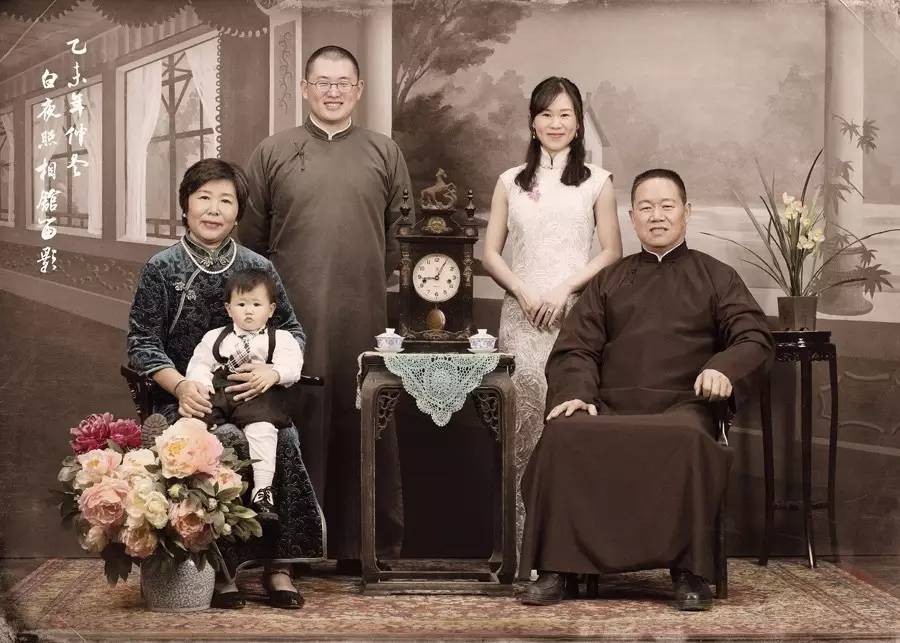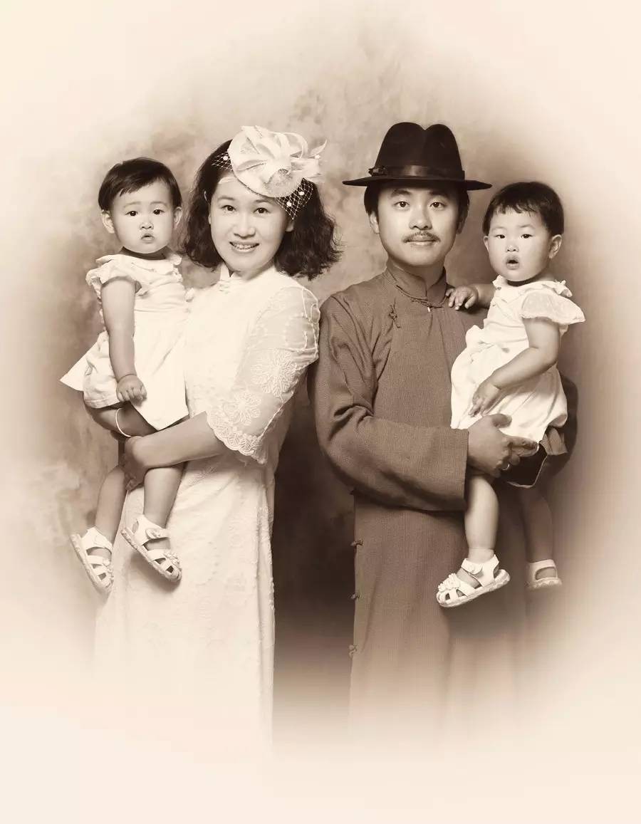庄老师是大连照相业的前辈,是传统手工上色照片和传统手工修复照片的专家,也是白夜照相馆的特约艺术顾问。这张全家福是使用数字相机拍摄并模拟传统手工上色进行后期修图。
