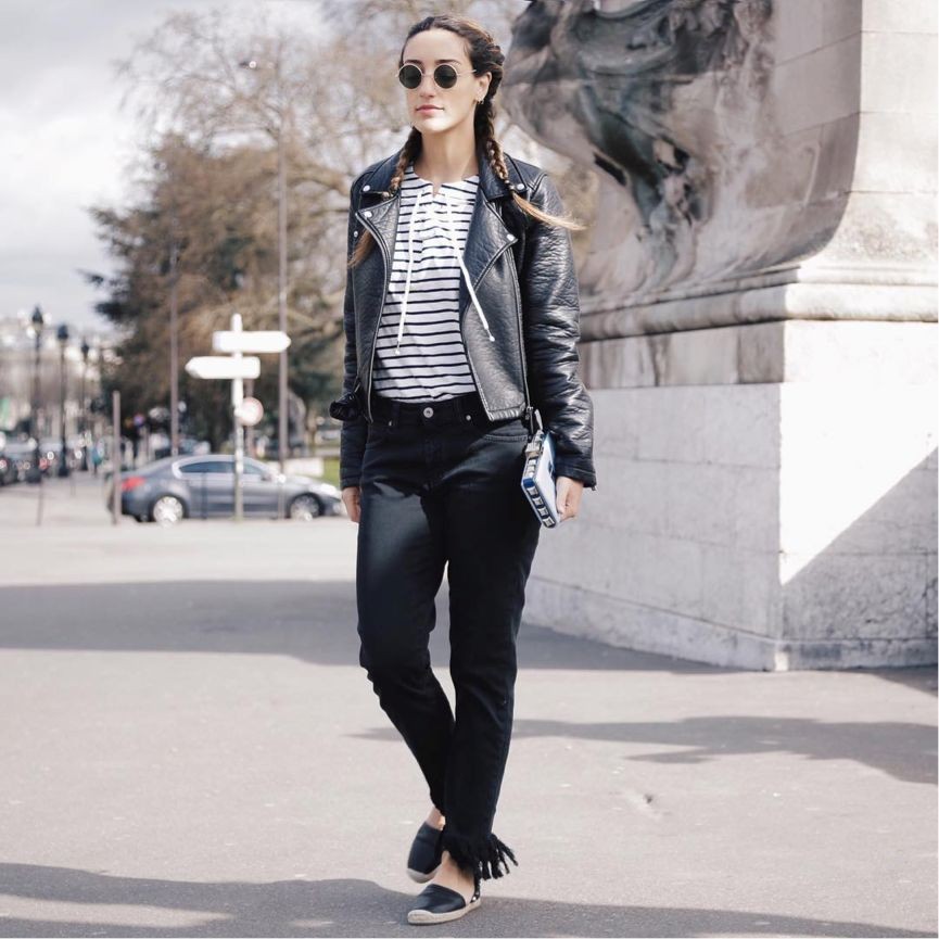 黑色机车皮衣搭配海魂衫带来帅气自在的美感