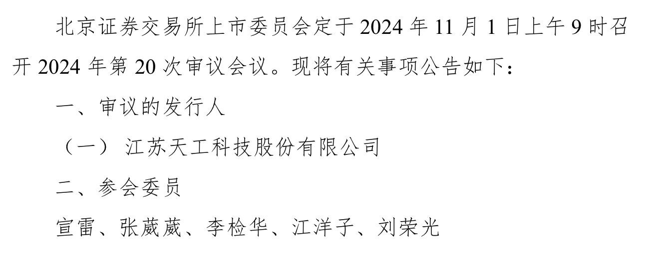 除了林泰新材外,天工股份(834549.NQ)也将在11月1日上午9时亮相。该公司的保荐机构是申万宏源承销保荐,会计师事务所为毕马威华振所,公司是在2023年12月29日获得的受理,曾在2024年8月30日上会但录得“暂缓审议”。