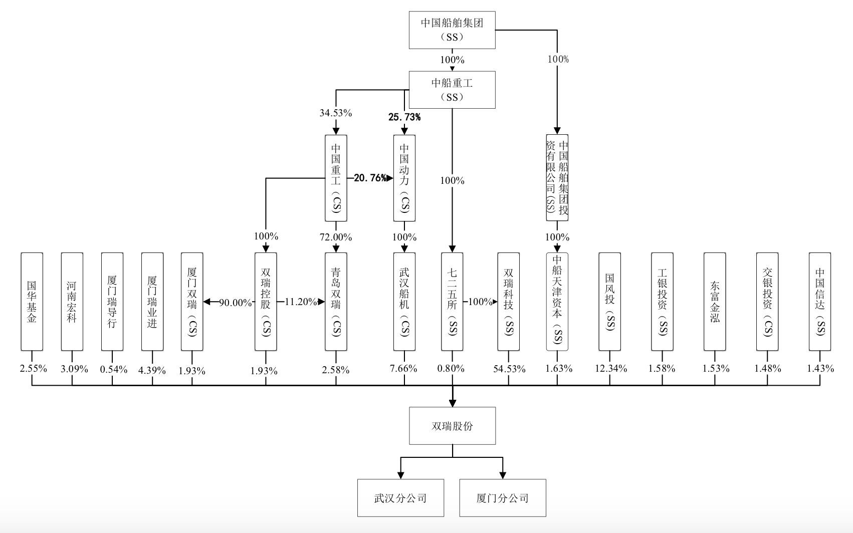 值得注意的是,双瑞股份控股股东是双瑞科技,持股比例54.53%。双瑞科技由七二五所100%出资。中国船舶集团通过双瑞科技、武汉船机、青岛双瑞、厦门双瑞、双瑞控股、中船天津资本、七二五所合计间接持有公司71.07%股份,为公司的实际控制人。而中国船舶集团由国务院国资委100%控制。