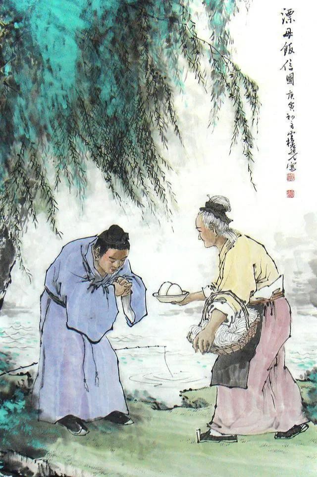 河边有个洗衣服的婆婆看他可怜,就天天给他送点吃的,这一吃就是几十天。后来韩信做了齐王,专门赶回送给这位婆婆一千金,这就是成语一饭千金的来历。
