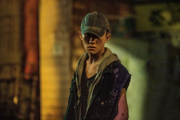 易烊千玺的角色应该是一位能打的街头少年,从他的穿衣打扮上可以看出来。把灰色背心的帽兜一戴,看着有点阴沉,“气场”二字大概是形容易烊千玺这个角色最好的用词。