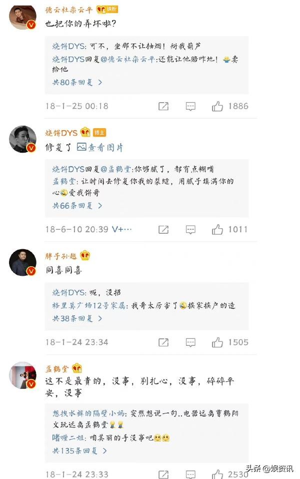 说个有趣的,早年关注他们的粉丝都知道,烧饼给孟鹤堂的备注是“孟鹤破坏堂”。
