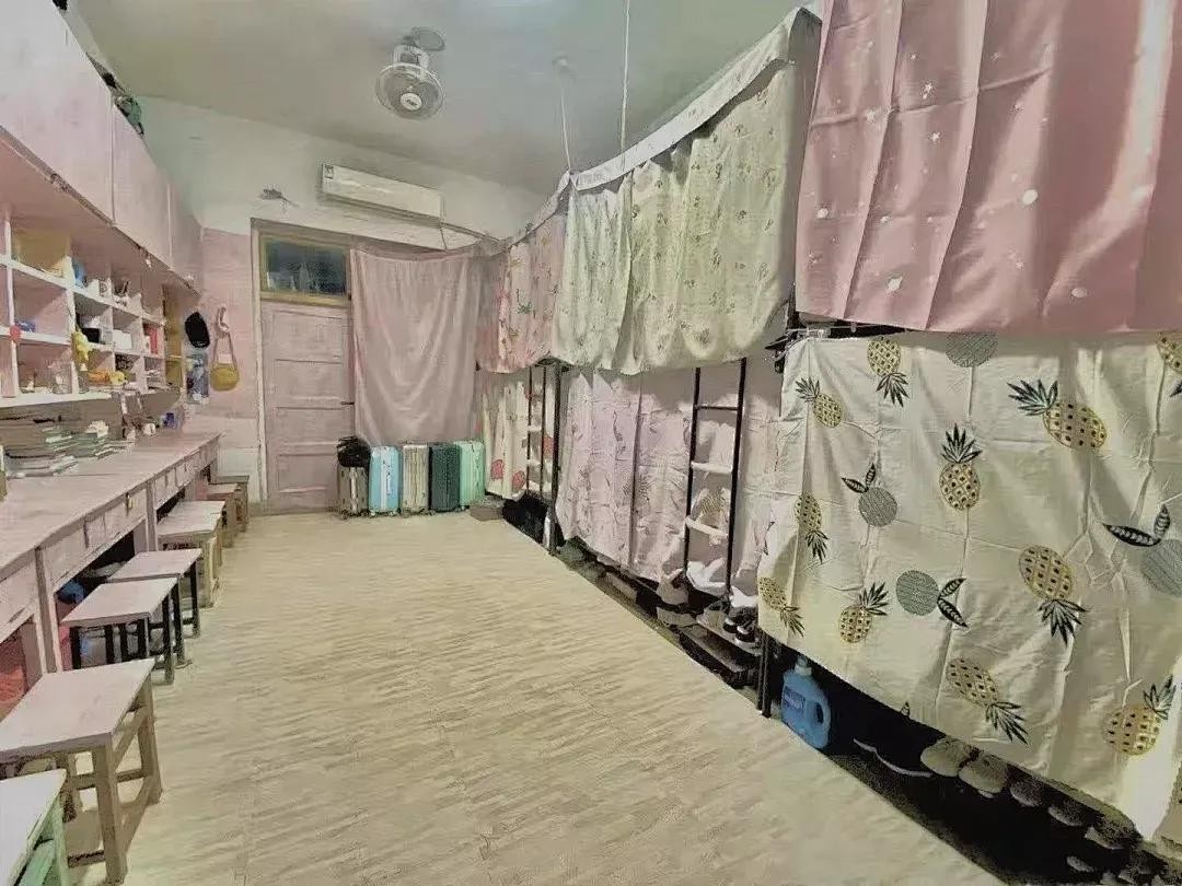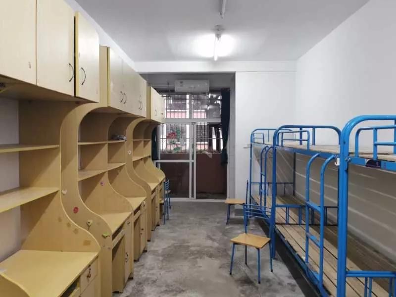 宿舍是六人间,上床下床,有空调,洗漱台,厕所,床的对面是一排桌子,柜子很大,女孩子东西挺多的也还能剩些空间,走廊尽头有公共浴室,洗衣机,还有公共吹风机,一个楼层有两个打热水喝的热水器、还有公共厕所。