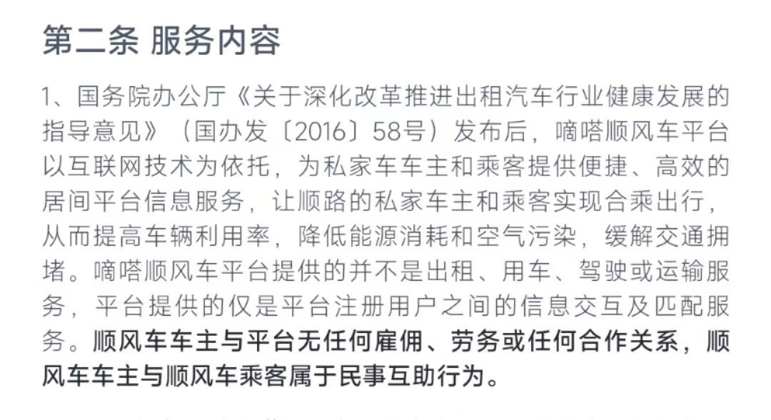 “区别于出租车、网约车等道路运输经营行为,合乘双方是平等的民事法律关系主体,而非卖方与买方、服务与被服务的关系,双方享有平等合乘、平等出行的权利。”嘀嗒出行平台在“合乘行为规范”中称。