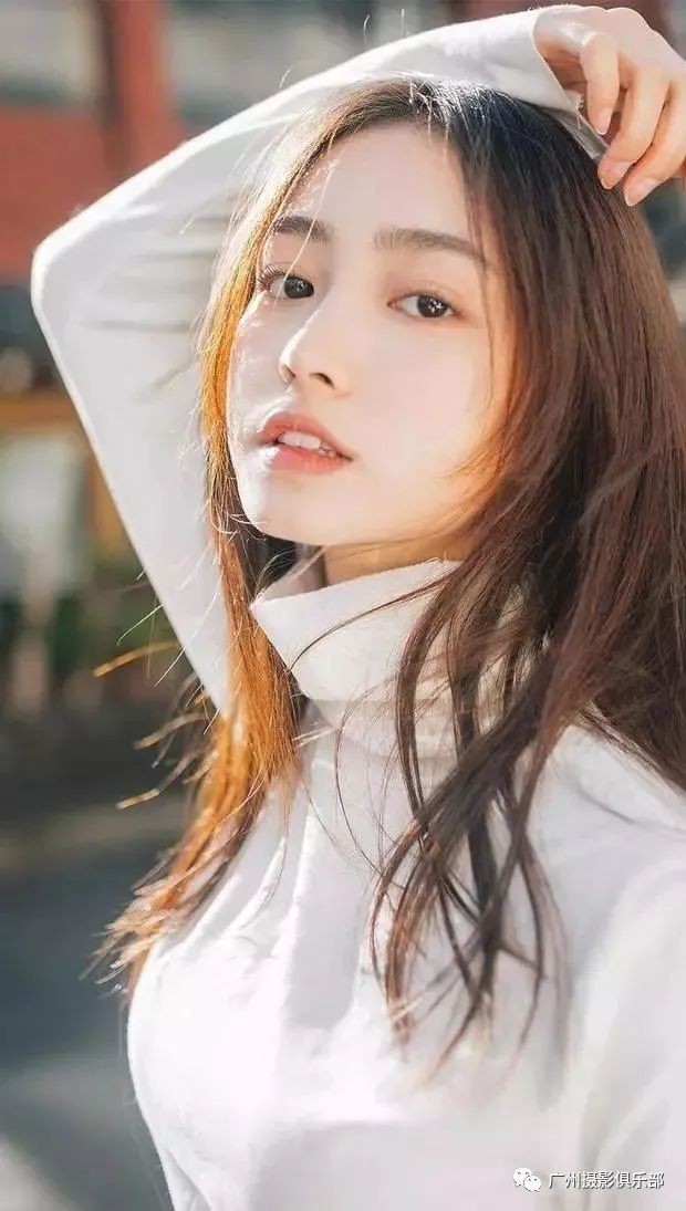 如果手上没有道具,那要怎么办?最简单的姿势,双手抱头,放在后脑勺处,看着镜头就可以了,因为双手抱头这个姿势本身就将女生的肩膀拉平,手肘外扩,所以不建议从侧面拍摄,避免出现胳膊变形的问题。
