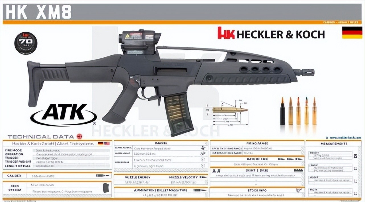 XM8为一款发射5.56×45mm NATO小口径步枪弹的突击步枪。它以短行程活塞气动式和枪机回转闭锁运作,性能和内部结构跟HK G36接近,枪托为伸缩式设计,供弹具也是跟G36一样的半透明弹匣,并能够把多个连接在一起以方便换子弹。但也因此不能在不装上适配器的情况下通用STANAG弹匣。