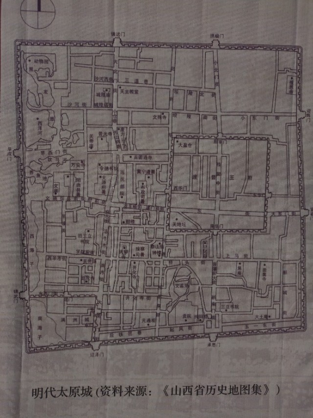 开八门,东为迎晖门(小东门),宜春门(大东门);南为承恩门(新南门),迎泽门(大南门);西为振武门(水西门)、阜城门(旱西门);北为镇远门(大北门)、拱极门(小北门)。