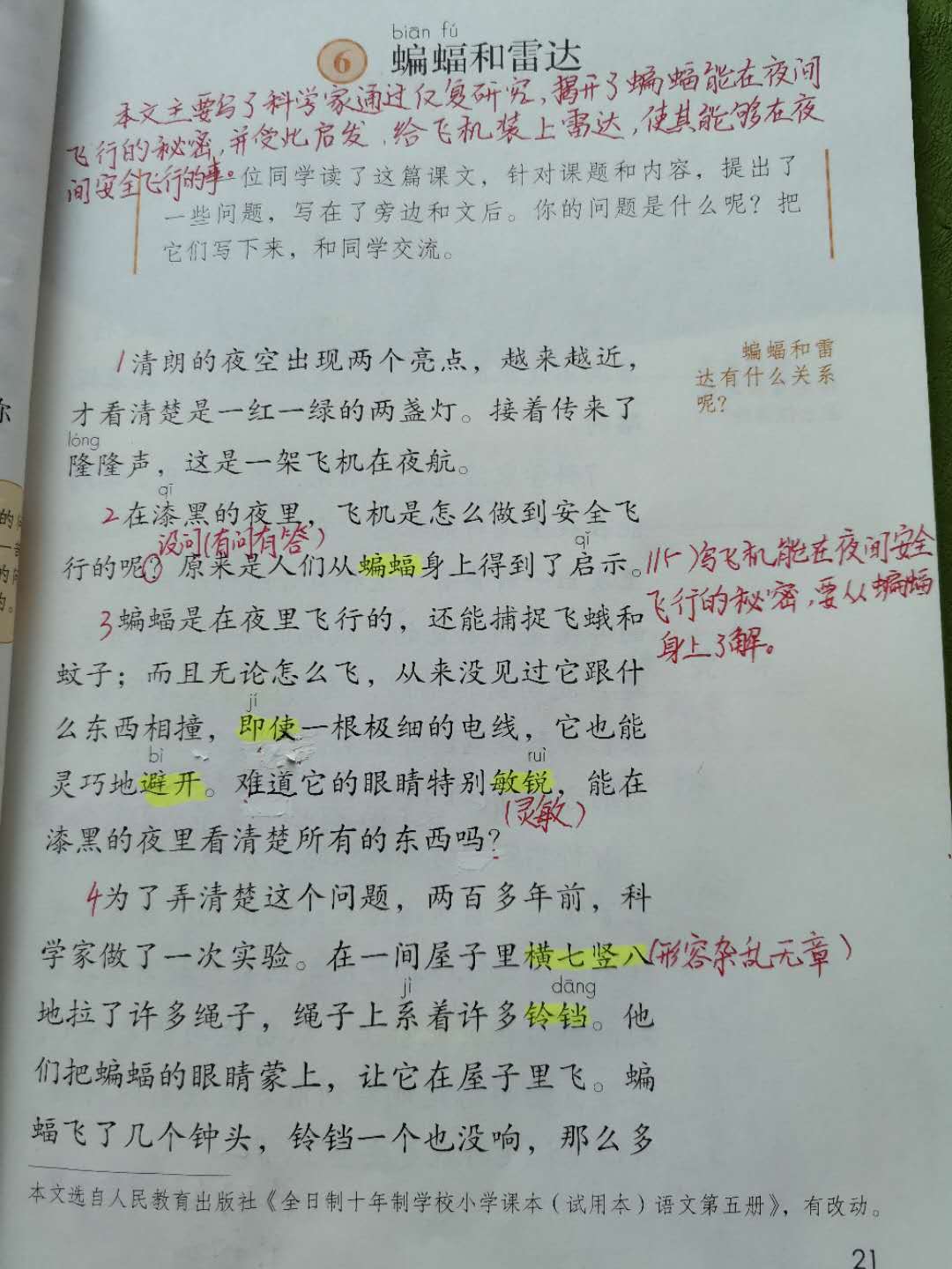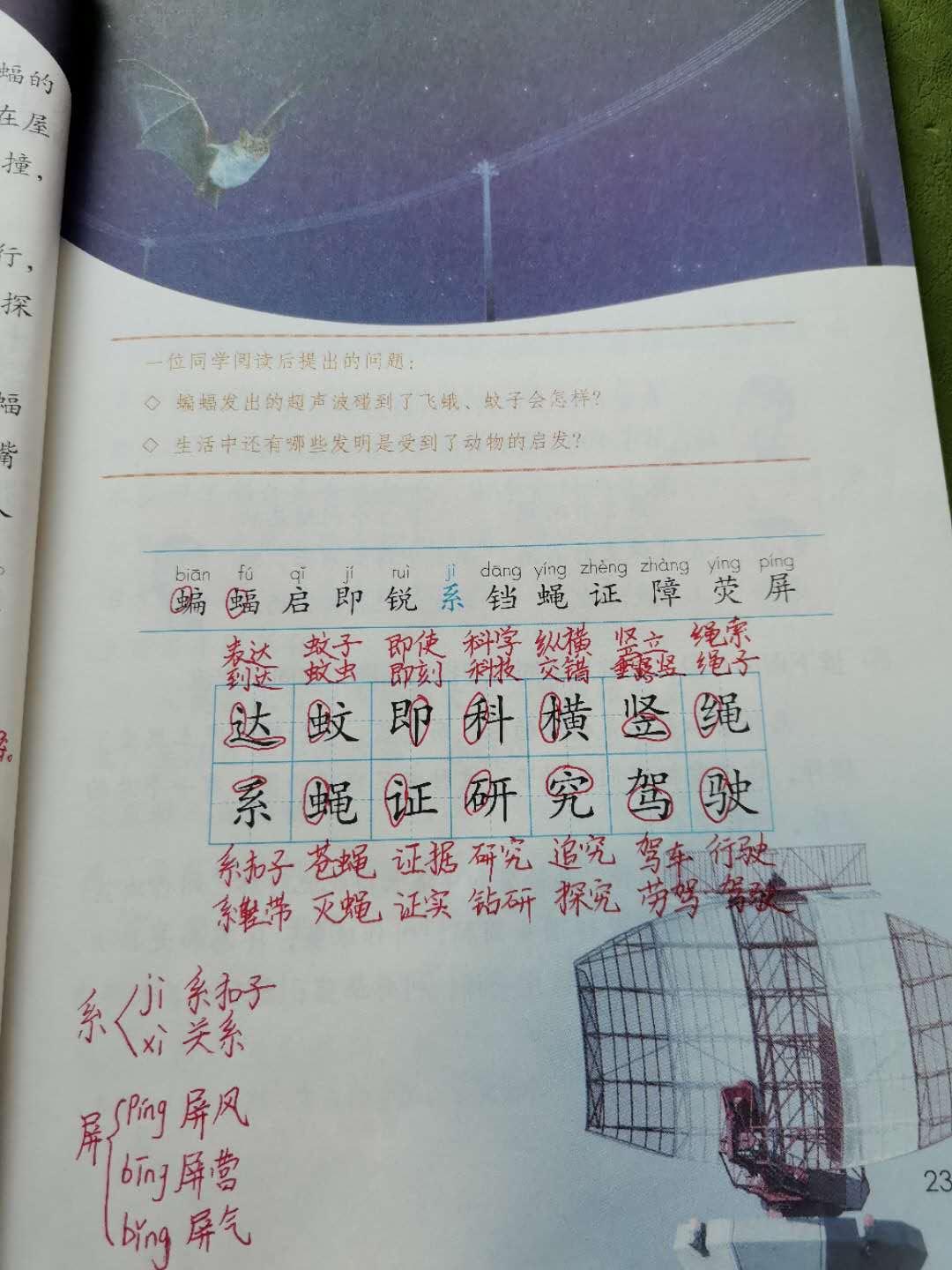 1、认识“蝙、蝠”等11个生字,读准多音字“系”,会写“达、蚊”等14个字,会写“雷达、蚊子”等13个词语。