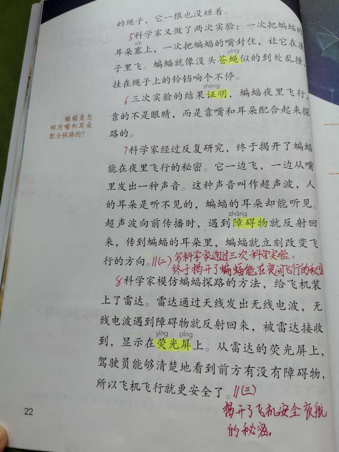 第二部分(3-7自然段)讲述了科学家通过三次科学实验,终于揭开了蝙蝠能在夜间飞行的秘密。