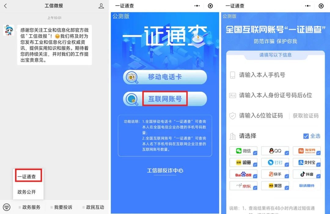 “一证通查”是中国信息通信研究院推出的全国互联网账号便民查询服务。目前支持查询的平台包括支付宝、淘宝、闲鱼、钉钉、微信、QQ、百度、快手、抖音、京东、美团等,并且还在不断地扩大范围中。