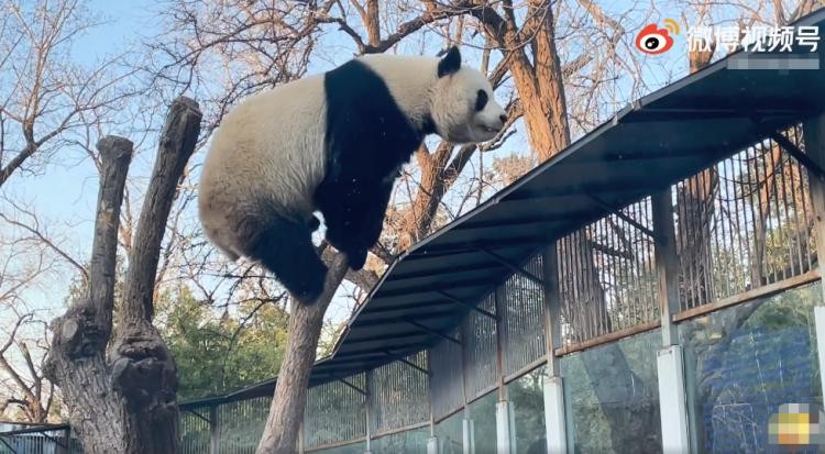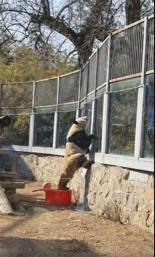 看他踩着工具爬上砖墙翻越栅栏,这一通行云流水的操作……真·功夫熊猫了!