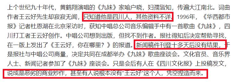 《九妹》也是90年代爆火的一首歌,演唱者是歌手黄鹤翔,唱完这首歌之后,黄鹤翔也火遍了大江南北,但是《九妹》这首歌的词曲作者却十分神秘,据说彼时出版这首歌的唱片公司收到了一封夹着歌谱的信,署名是王云好,可是当歌曲发行之后公司想给王云好寄稿费时,却发现根本查无此人。