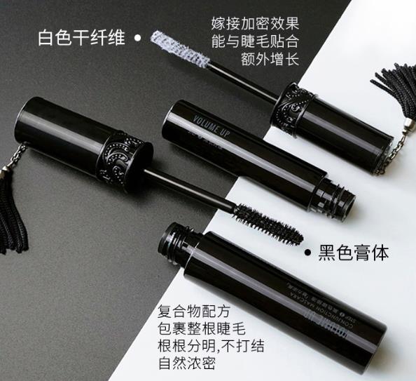 第一次看到双管睫毛膏(一管黑色膏体+一管白色干纤维)还是很惊讶的。白色干纤维呈羽丝状,与睫毛膏交替使用,睫毛会变长增密,有一种做了嫁接睫毛的效果。