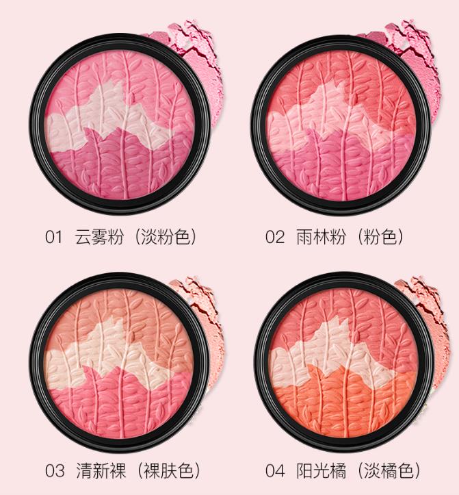 一共有四个色系,雨林粉、阳光橘、云雾粉、清新裸。颜色很淡,可以反复刷,新手通过几次尝试也可以轻松拥有少女气色。配套的月牙粉刷也是谜之好用,可以横扫脸部更多面积,会更自然。