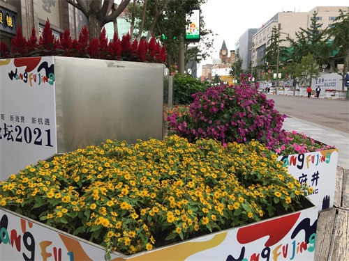 步行街提供了许多供游客休息的座位,座位旁有盛开的鲜花,累了不妨休息一下。