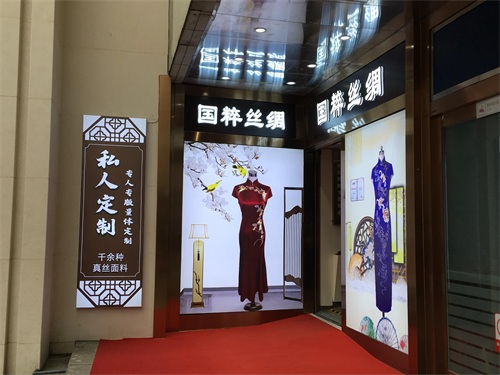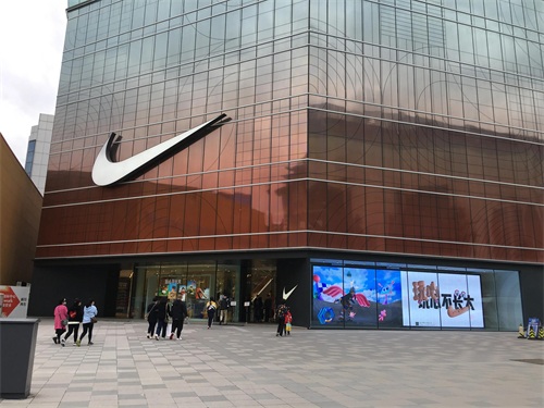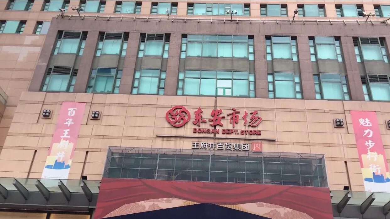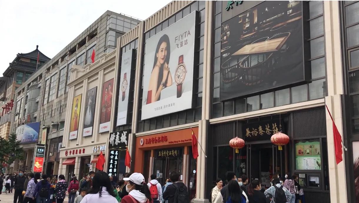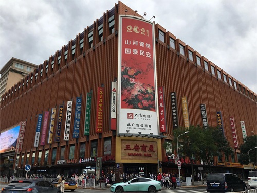 这是王府商厦,砖红色条状的建筑装饰风格彰显恢宏大气,引人瞩目。从两侧整齐的招牌可以看出这里云集众多商家。
