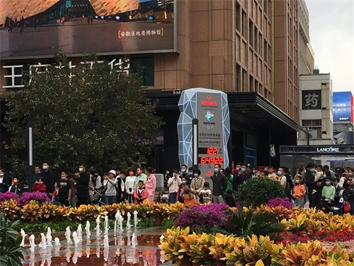 北京市百货大楼前的音乐喷泉吸引了众多游客驻足观看。