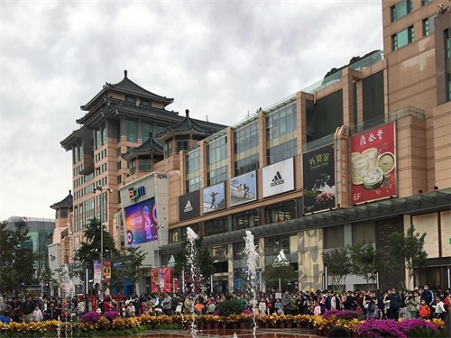 走过东单三条就进入了王府井商业步行街。这里的建筑宏伟壮观,假日里游客众多。
