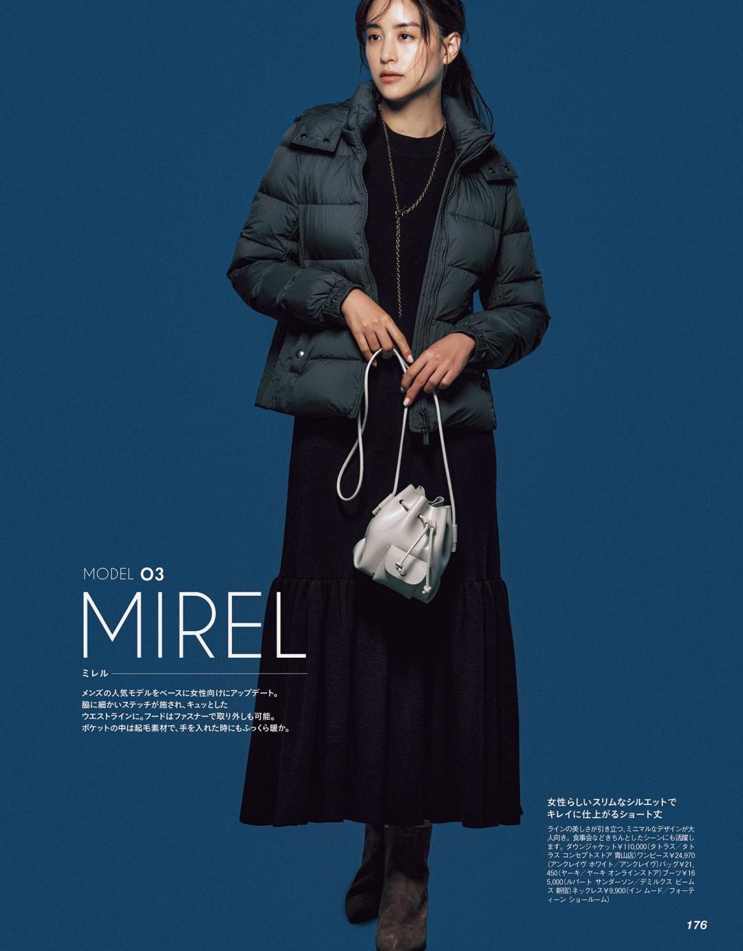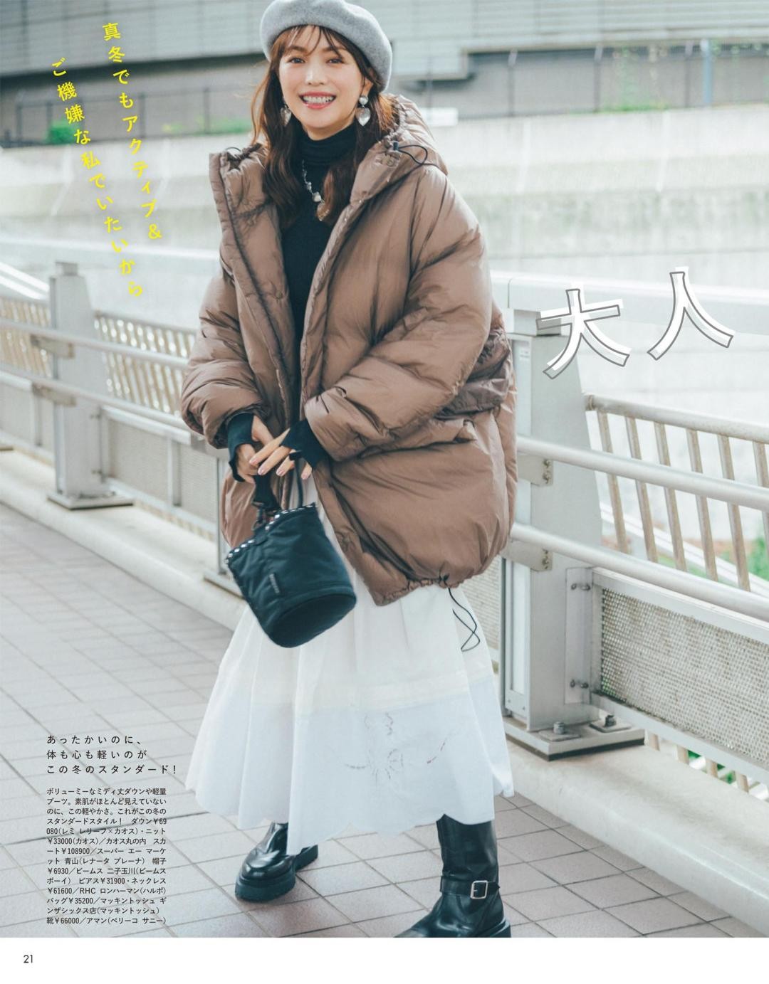 要想把羽绒服和裙子搭配得时尚又高级,同色系是个很好的选择。