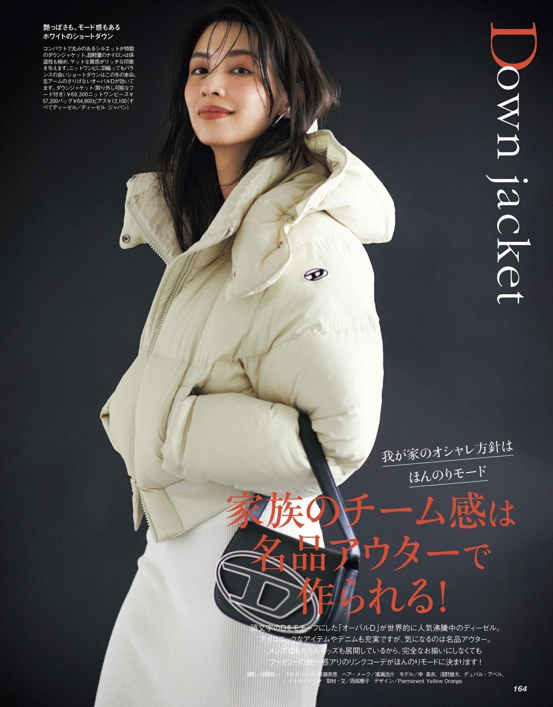 因为羽绒服和裙子的面料不同,可以在视觉上形成层次感,让整体造型更加丰富。