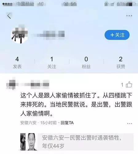 9月30日晚,霍邱网警接网友举报称一网名为“酷炫宝”的网友在网上造谣称:“这个人是跟人家偷情被抓住了,从4楼跳下来摔死的……”