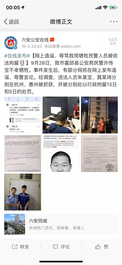 一举抓获网上造谣污蔑牺牲民警的网友两名