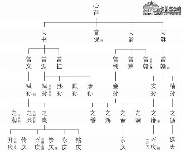 据翁万戈介绍,由于翁同龢没有子嗣,他的家藏均传给他哥哥翁同爵过继给他的儿子翁曾翰。在之后的传承中,又有两人因没有子嗣,均从翁同龢另一个哥哥翁同书那一支的血脉里,过继给孩子来继承。文端公有四子二女:长子翁同书,谥文勤,第二子早殇,第五是翁同爵,字玉甫,第六是翁同龢。