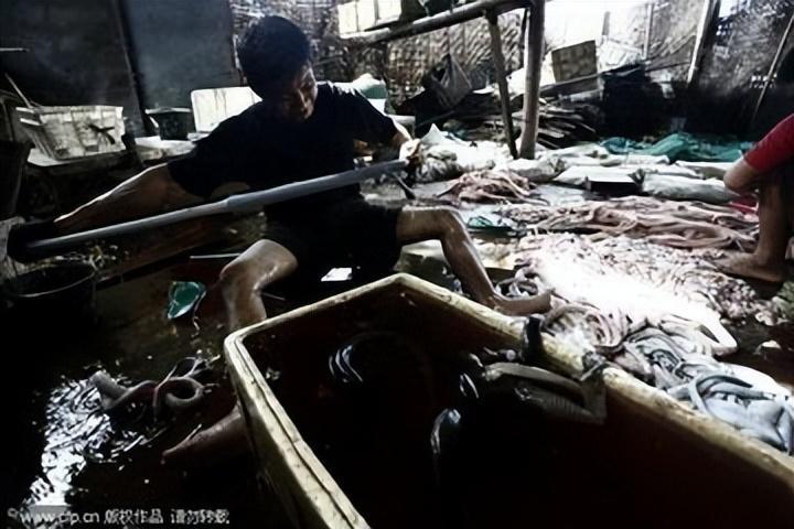 养蛇人手上坑坑洼洼,旧伤还没好又添上了旧伤,都是被蛇给咬的。熟练处理被蛇咬伤后的伤口,几乎是养蛇人的必备技能。