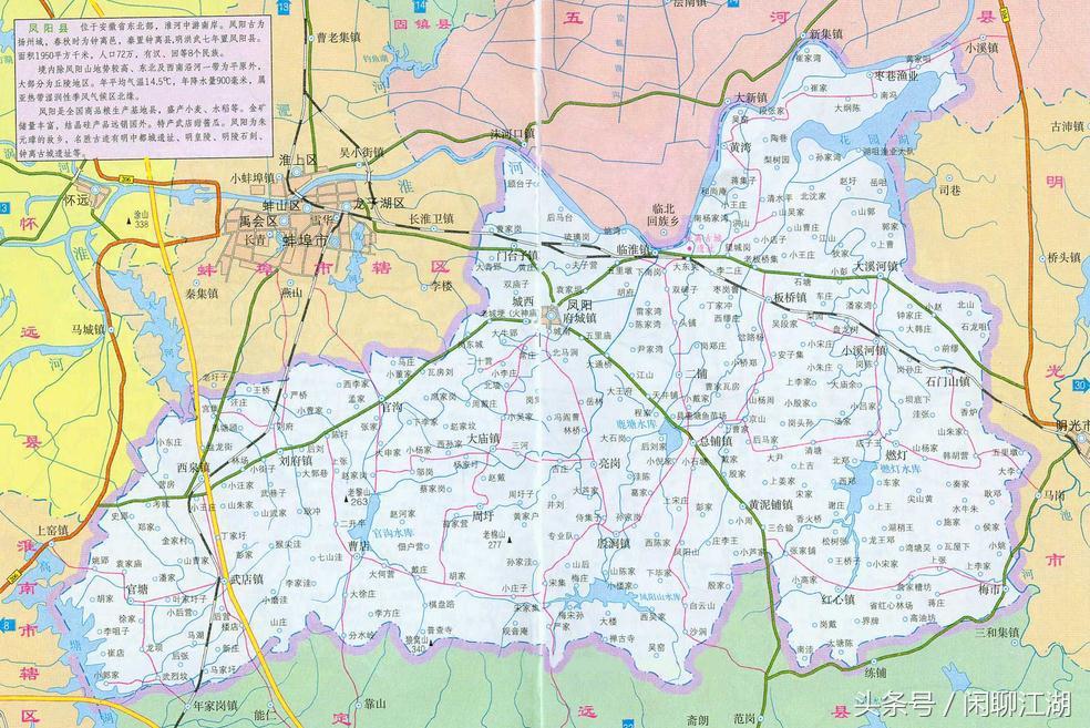 凤阳县东西长74.64千米,南北宽49.6千米,总面积1949.5平方千米,总人口为74.9万(2009年底),县人民政府驻府城镇西华路人民广场。凤阳县辖14个镇、1个乡。
