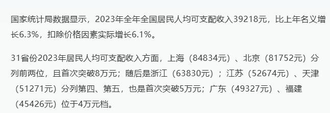 31省份去年居民人均可支配收入公布:京沪破8万,8省份超全国水平,2024-01-20 澎湃新闻