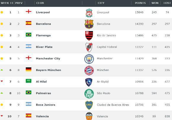 利物浦领跑,巴萨、巴甲弗拉门戈依然占据世界前三,河床、曼城分列四、五位;六到十位分别是拜仁、利雅得新月、帕尔梅拉斯、博卡青年、瓦伦西亚。