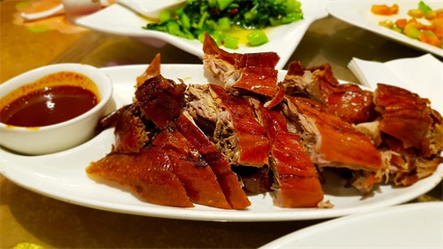 3. **金陵烤鸭**:具有独特的风味和深厚的文化底蕴。选用南郊麻鸭,经过精心烤制,烤鸭的皮香脆酥松,鸭肉酥嫩鲜香。色泽金红、油润光亮,散发着诱人的香气。食用时,搭配甜面酱等调料,味道令人难忘。