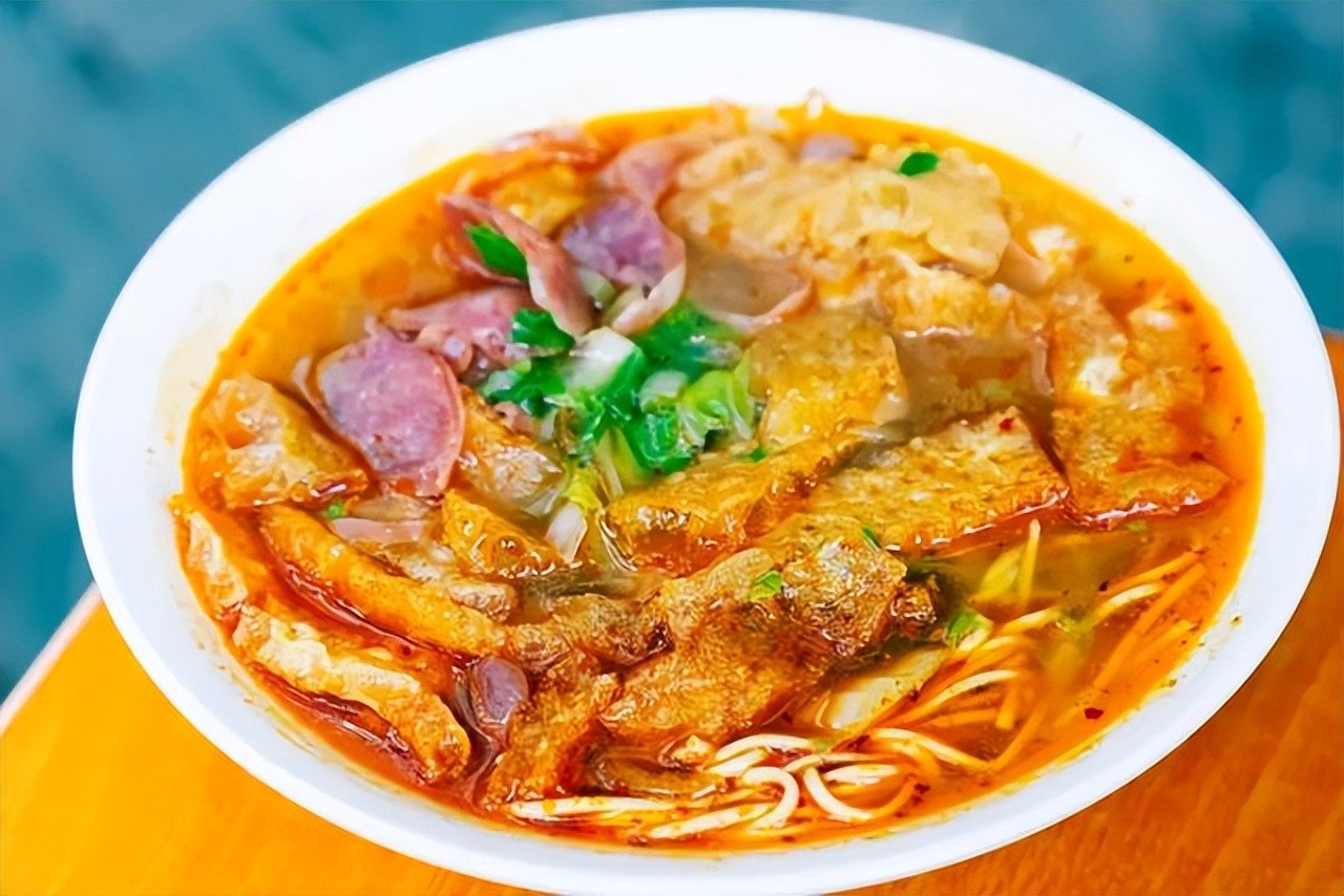 11. **皮肚面**:大碗皮肚面是地道的南京美食。皮肚炸得蓬松,汤中飘着油香。八分熟的呛面搭配细薄的肉丝、鲜嫩的猪肝、丰润的腰花等食材,再佐以辣油、花椒粉、芝麻粒等佐料,味道浓郁够味。