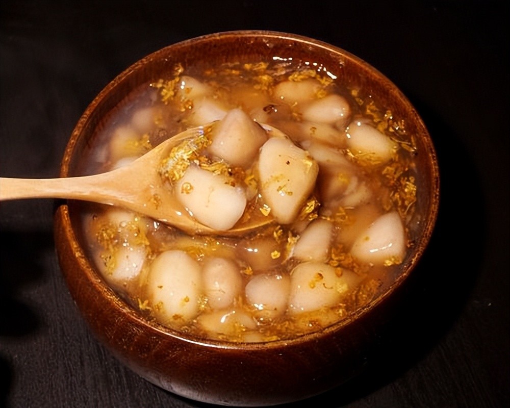 18. **桂花糖芋苗**:南京著名的传统甜点,与桂花蜜汁藕、梅花糕、赤豆元宵并称为金陵四大最有人情味的街头小食。选用新鲜芋苗蒸熟剥皮后,搭配特制的桂花糖浆慢慢熬煮而成。外观呈酱红色,汤汁鲜亮诱人,口感润滑爽口、香甜酥软,散发着浓郁桂花香。