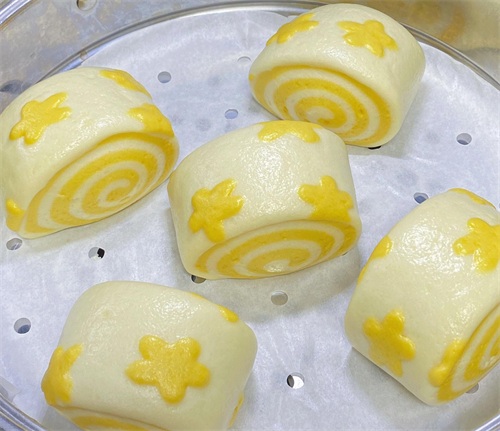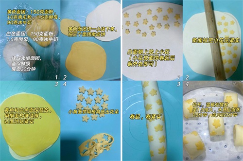食材:黄色面团:中筋面粉150克,南瓜粉10克,酵母1.5克,冰牛奶90克。白色面团:中筋面粉150克,酵母1.5克,冰牛奶90克。此外,还需准备适量模具用于制作花朵形状。
