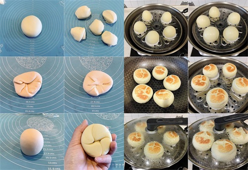 5、在锅中加入适量开水,将烙制好的馒头放入蒸笼中,底部朝上,大火蒸制20分钟。蒸好后不要急于开盖,焖3分钟再揭开,这样馒头会更加松软可口。