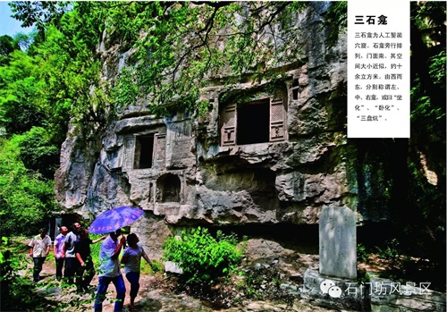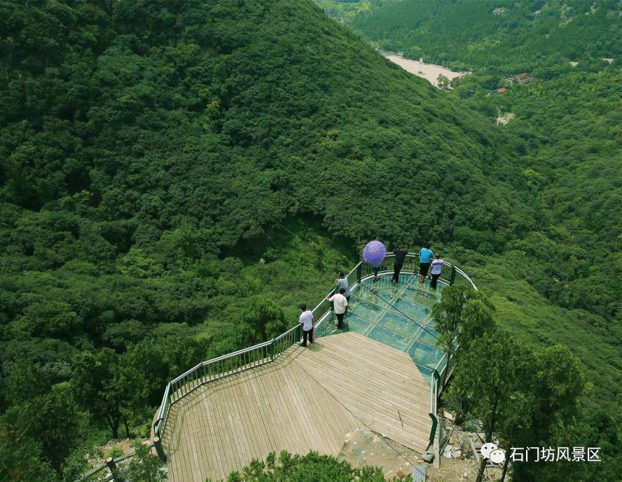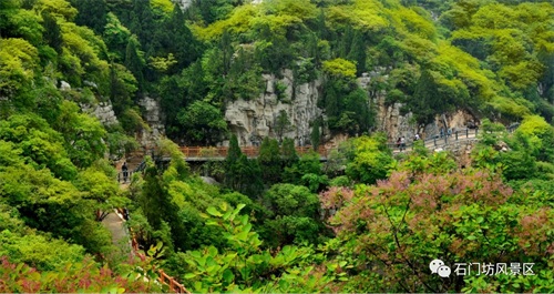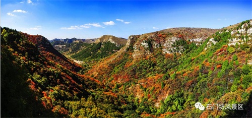 石门坊为国家AAA 级旅游区,因深山入口处双峰耸立,对峙如门而得名。风景区内有天然的黄栌滋生,树林区高达3000余亩。每值深秋,霜染黄栌,红叶满山,如火似霞;间以苍松翠柏与之映衬,远远望去,泼红嵌绿,令人流连忘返,古人云:“霜栌秋桧染红山,坐爱清幽忘回返”。