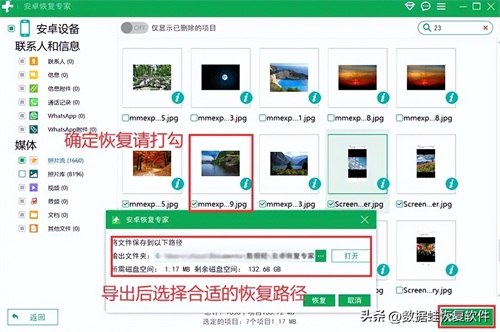 步骤3:在扫描完成的列表中查看图片,对需要恢复的图片进行勾选,然后点击【导出】,然后选择保存路径即可恢复。操作完成后一定要查看图片保存的文件夹,确保完全恢复。