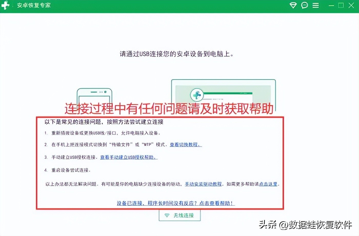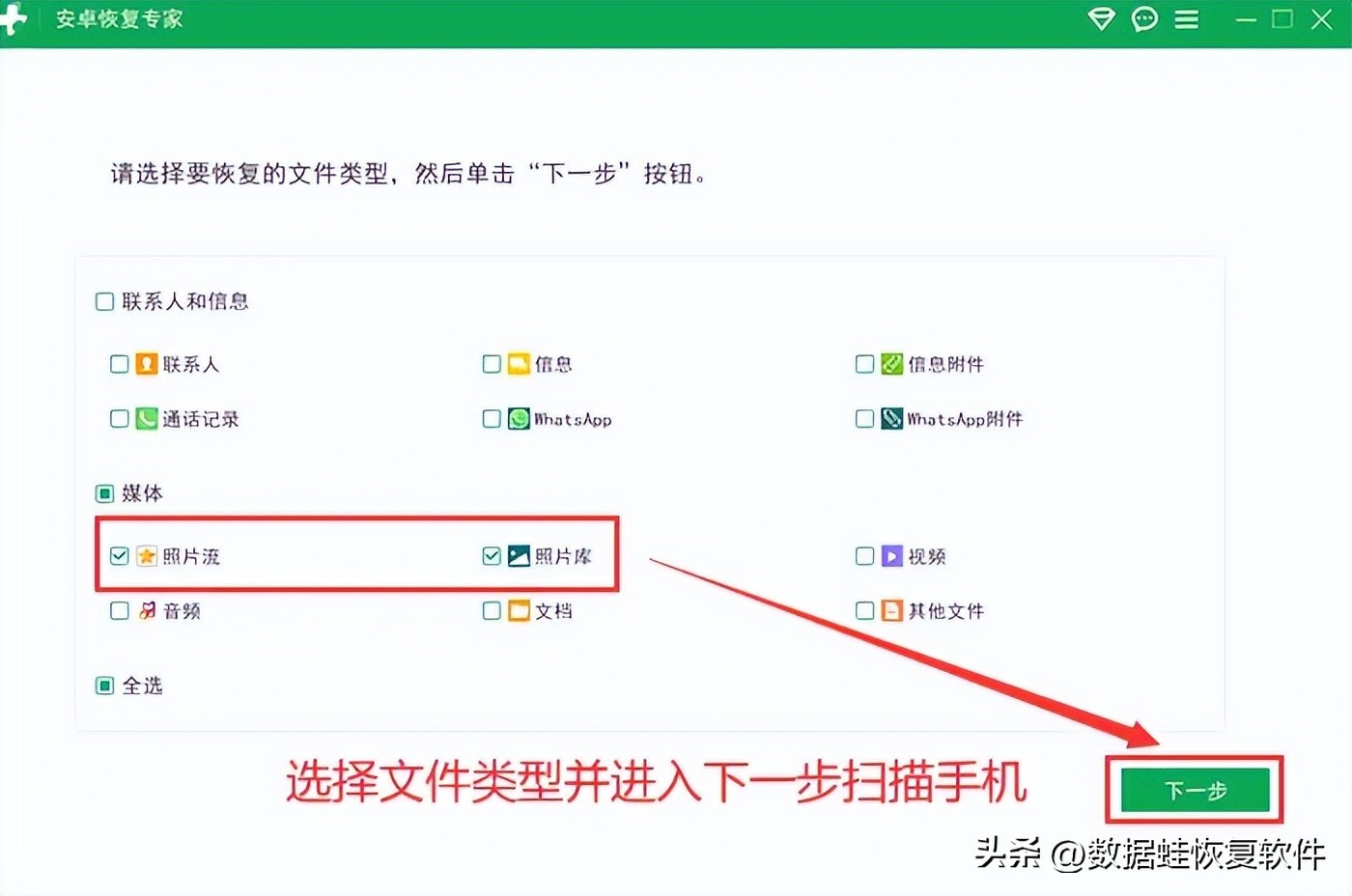 如果以上两种方法都无法找回丢失的照片,还可以考虑使用数据恢复软件进行尝试。市面上有许多数据恢复软件可供选择,比如【数据蛙安卓恢复专家】,可信赖且保密性极好,能够尽可能帮助我们恢复手机误删照片。我们不需要耗费很多精力去学习数据恢复的技术手段,只需要根据提示进行操作,极大概率就可以轻松恢复图片!小编的操作过程如下: