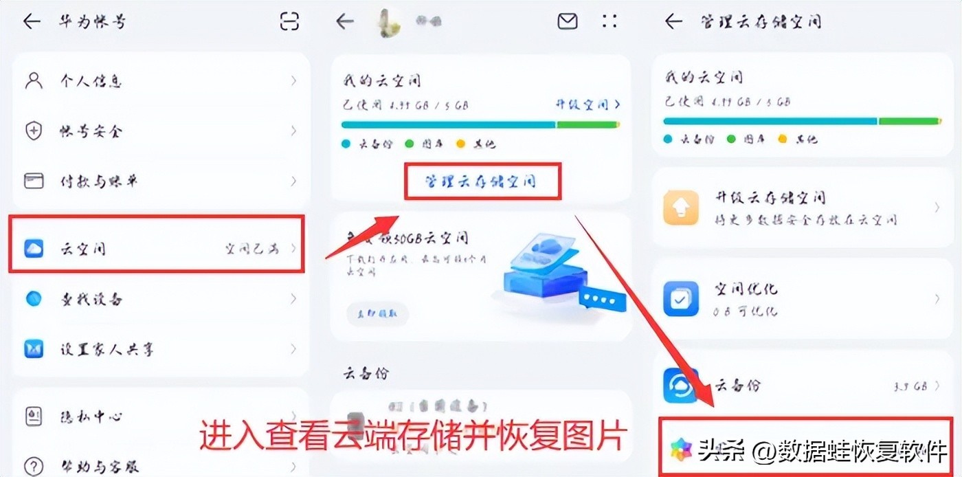 步骤2:管理云存储空间,进入查找图库并浏览照片,找到需要恢复的照片恢复到相册中。