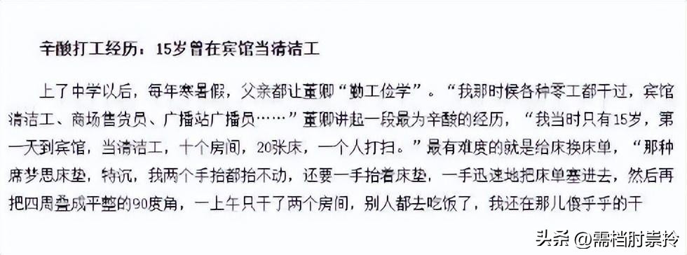 董卿中学的时候,父亲还让她去体验生活,做兼职赚零花钱,要知道,当时董家的经济条件并不差,父亲这样做完全是为了磨练女儿的意志,长期在这种高压环境下,董卿虽然学习成绩优异,但也养成了隐忍、克制的性格,甚至有些缺乏安全感