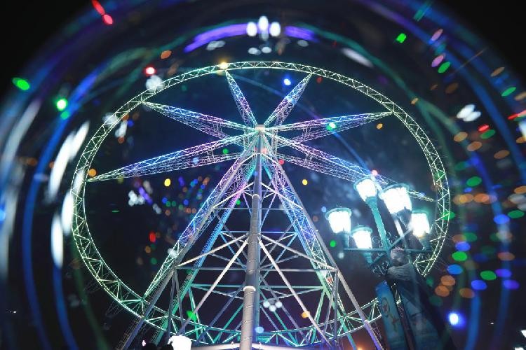 大摆锤点亮华丽的彩灯、闪耀的珠光,如同带上女王的皇冠一般,赢得女皇般梦幻的想象。湖面倒映着斑斓的“星光”,这波光粼粼的水面,被风吹过,泛起阵阵涟漪,一片接着一片,调皮地闪动……
