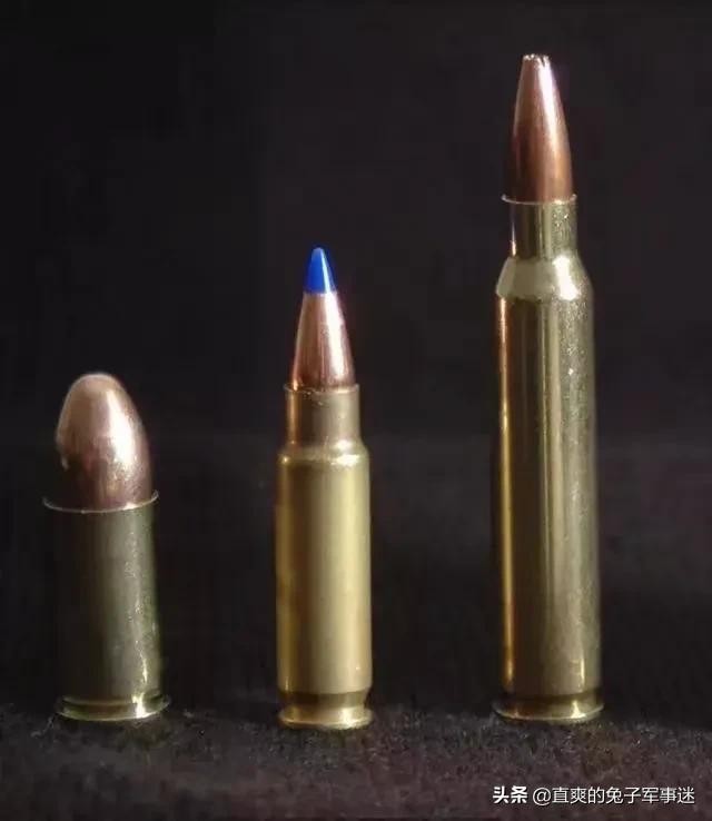 图:9毫米手枪弹、5.7手枪弹、5.56步枪弹对比。DAP92式5.8mm手枪弹于2001年批准定型,全弹重6克,比51式弹轻44%,初速(V5)为480±10米/秒。