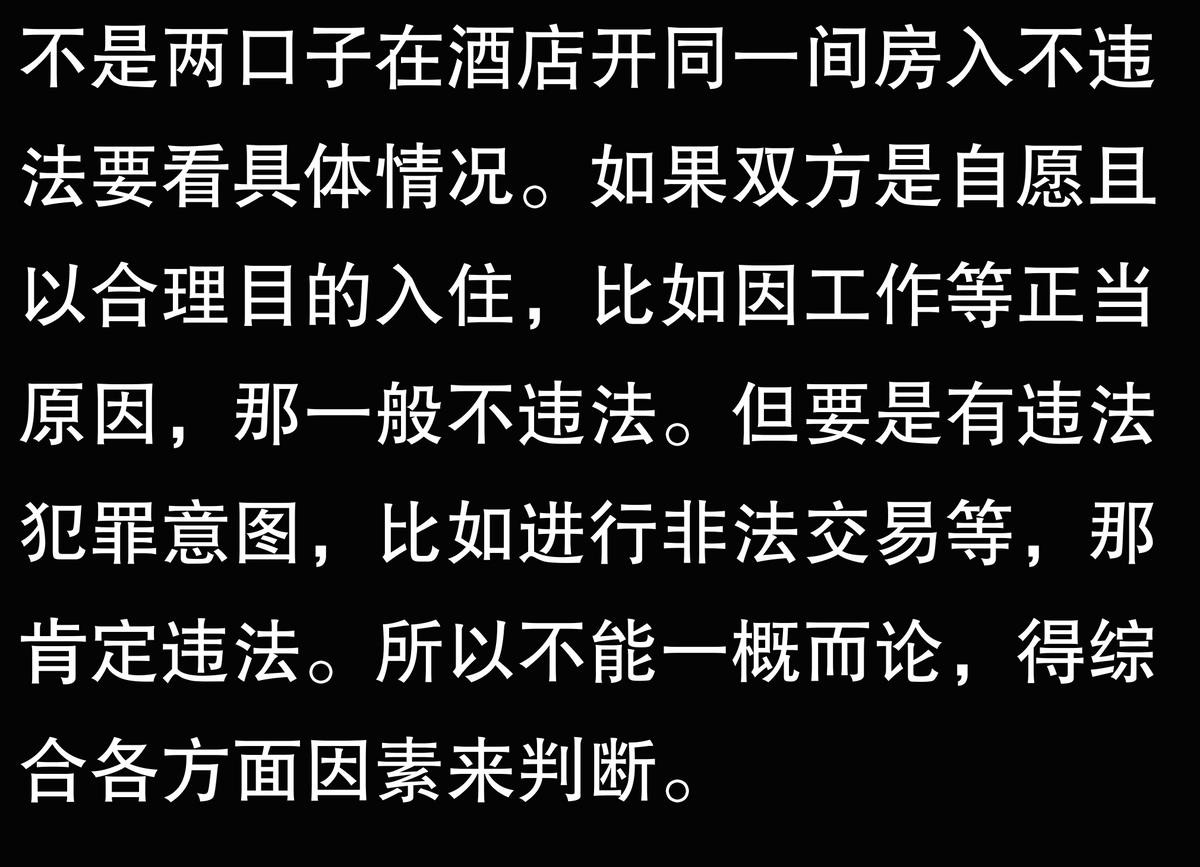 我活了几十年,头一回寻思这事儿。那天跟朋友聊起来,说有俩人不是两口子,在酒店开同一间房。我就纳了闷了,这违法不?上网一查,说法还真不少。有人说不违法,只要能证明俩人没关系就行;可也有人说,要是被警察查房啥的撞上,解释不清就麻烦了。真挺纠结这到底咋算,以后可得多注意,别一不小心踩坑里。